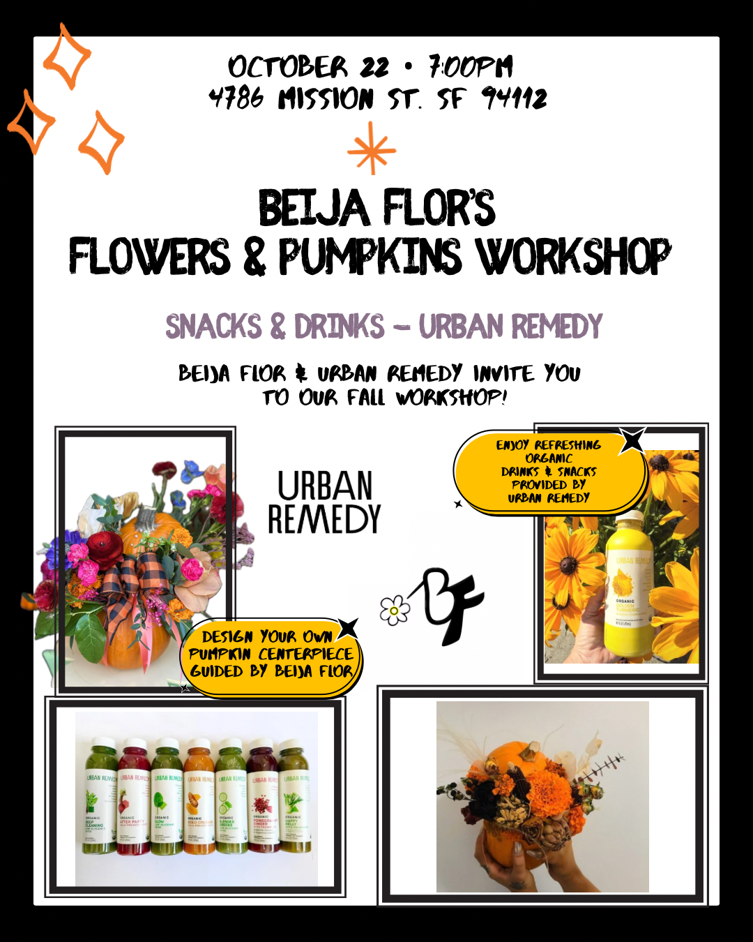 Join us this fall for our next workshop on October 22nd at the shop! We’re teaming up with @UrbanRemedy to bring you an organic Halloween vibe! We’ll be designing fresh flower pumpkin centerpieces while enjoying yummy refreshing snacks & drinks sponsored by @UrbanRemedy ! Let your mind get creative & your body feel nourished; Trick AND Treat!! Grab your tickets here!
